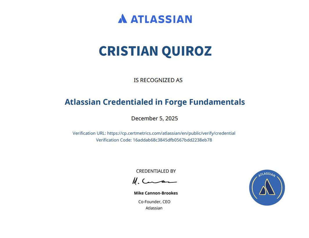 Diseño y desarrollo de aplicaciones personalizadas e integraciones avanzadas para el ecosistema Atlassian cuando las capacidades nativas de Jira no cubren los requerimientos del negocio. Experiencia extendiendo la plataforma mediante Forge, APIs de Atlassian y arquitecturas de integración para conectar Jira con sistemas empresariales, automatizar flujos de información y centralizar procesos operativos.